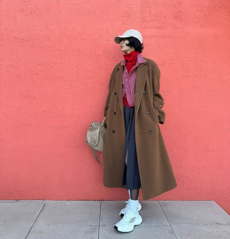 오버사이즈 브라운 코트는 포멀한 느낌을 주지만, 이너로 레이어링한 아이템들은 유니크하게 스타일링 했다.