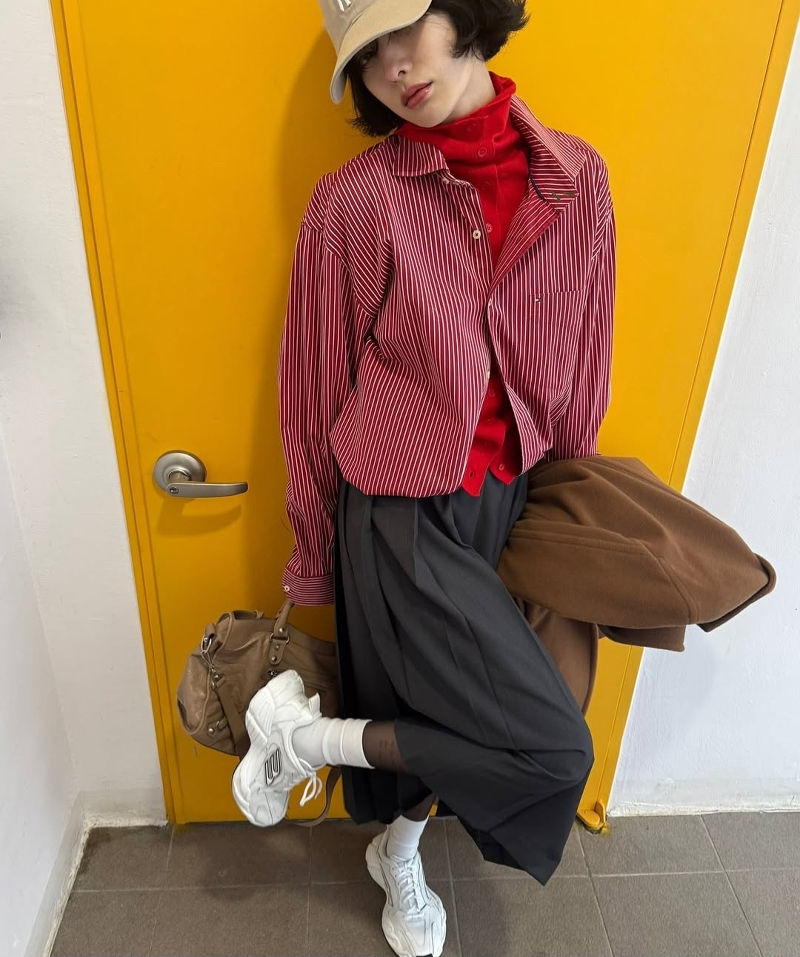 레드 컬러의 터틀넥과 스트라이프 셔츠를 조합해 색상의 대조를 강조했고, 스커트의 트임 디테일은 시크한 분위기를 연출해 준다.