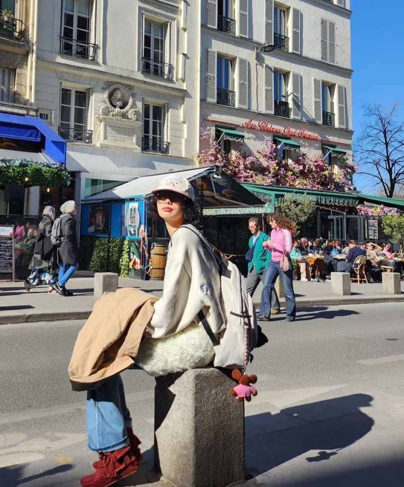 여기에 화이트 스니커즈와 삭스를 매치해 클래식함과 스포티한 무드를 잘 살려냈다. 함께 매치한 볼캡과 넉넉한 사이즈의 숄더백 역시 스타일리시함을 더해준다. 다양한 요소를 믹스매치했는데도 어색하지 않고 조화롭게 스타일링한 점이 돋보인다.