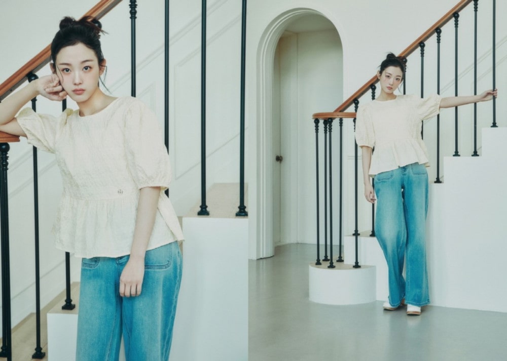 여름에 어울리는 퍼프소매 블라우스와 데님팬츠 조합도 눈길을 끈다. 허리선이 살짝 높은 베이비돌 핏앤플레어 라인의 블라우스는 이유미의 귀엽고 페미닌한 분위기를 한층 부각시켜준다. 함께 착용한 하이웨이스트 부츠컷 데님은 시원한 인디고 컬러에 핏 되지 않으면서도 슬림한 실루엣으로 바디라인을 강조한다.