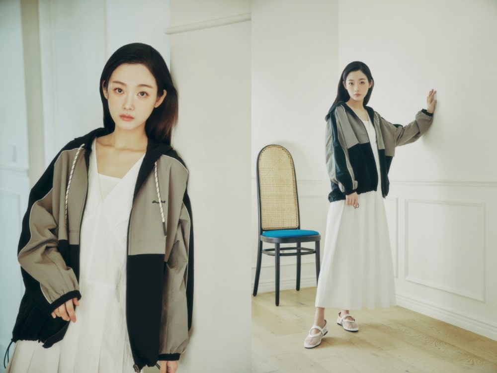 쥬시쥬디 모델 이유미는 특유의 표현력으로 브랜드 아이덴티티에 꼭 맞춘 다양한 스타일링을 완벽히 소화했다. 첫 번째 화보에서는 집업점퍼와 플리츠 롱 원피스를 믹스매치했다. 컬러블록으로 배색 포인트를 준 후드형 점퍼를 드레시한 원피스의 위에 레이어드해 여성스러우면서도 캐주얼한 상반된 매력을 표현했다. 사이드 포켓에 손을 넣고 벽에 가볍게 기댄 이유미의 모습은 도시적인 무드를 완성한다.