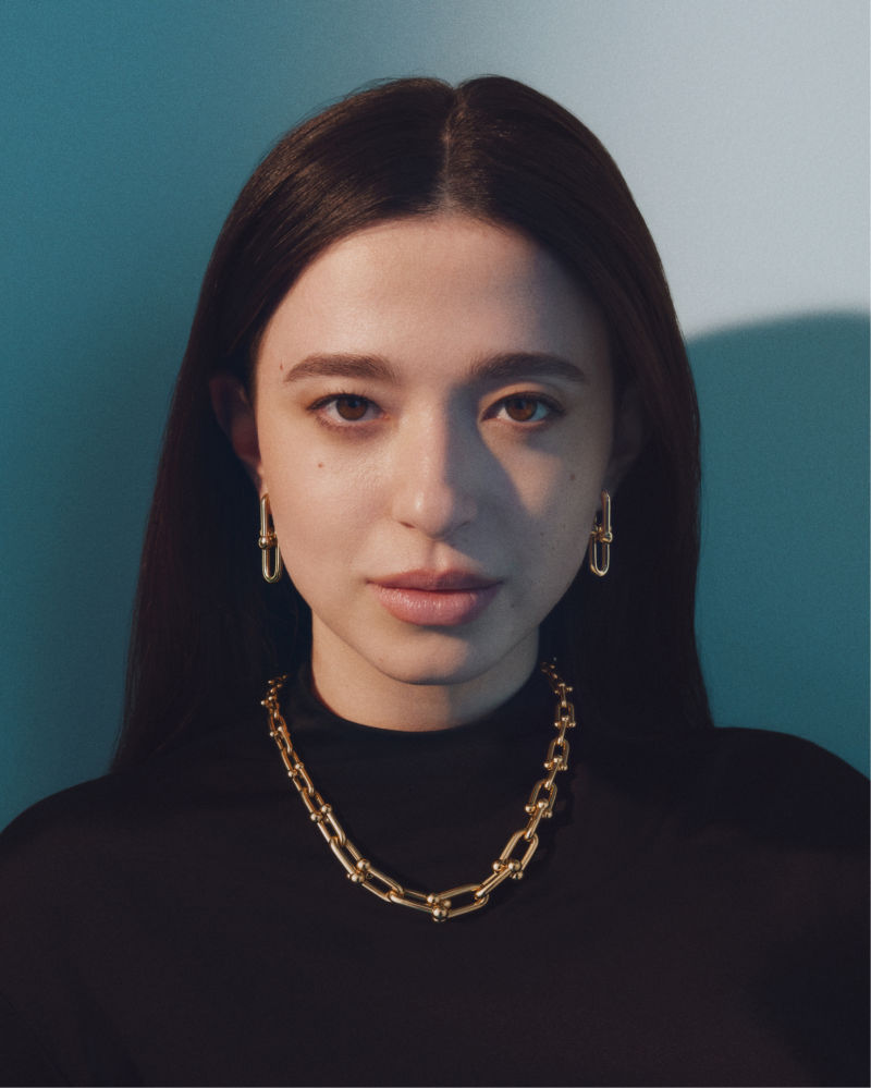 다이아몬드가 세팅된 하드웨어 컬렉션의 골드 네크리스, 이어링 그리고 브레이슬릿을 착용한 마이키 매디슨(Mikey Madison) “스스로에 대한 확신이 없을 때는 연약해 보일 수 있지만, 강인한 것들을 떠올리며 힘을 얻죠” 라고 전하며, 사랑과 회복력의 의미를 이야기한다.