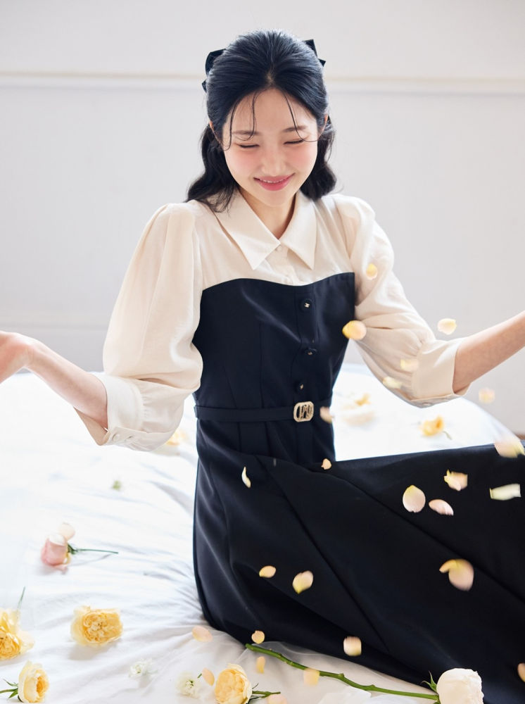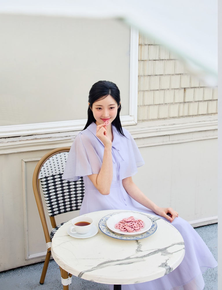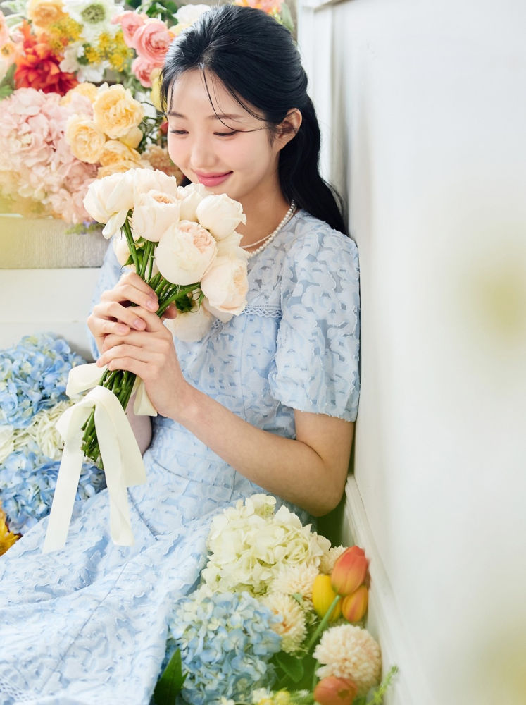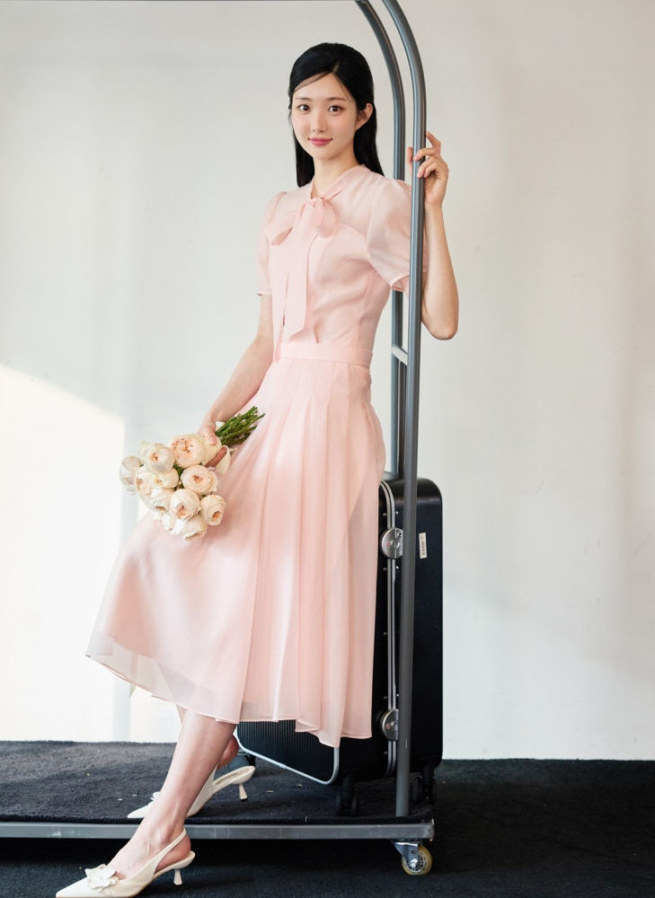 특히 슬림하게 잡아준 허리 라인의 플레어 원피스는 로맨틱한 분위기를 더해주며, 네크라인의 리본 디테일과 파스텔 톤 컬러는 화사하고 사랑스러운 무드를 완성한다.