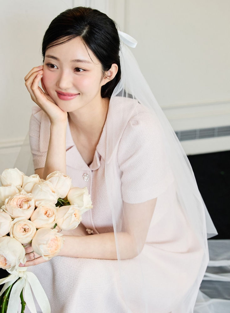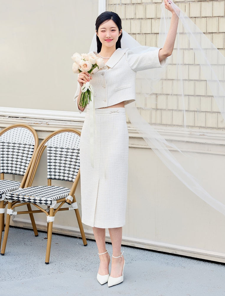 입체적인 레이스 원단으로 섬세한 조직감을 살린 원피스와 H라인 스커트, 자켓으로 구성된 트위드 셋업은 화이트 베일을 매치하여 스냅 촬영이나 브라이덜 샤워 등 예식 준비는 물론 상견례 등 격식을 갖춰야 하는 다양한 자리에도 잘 어울린다.