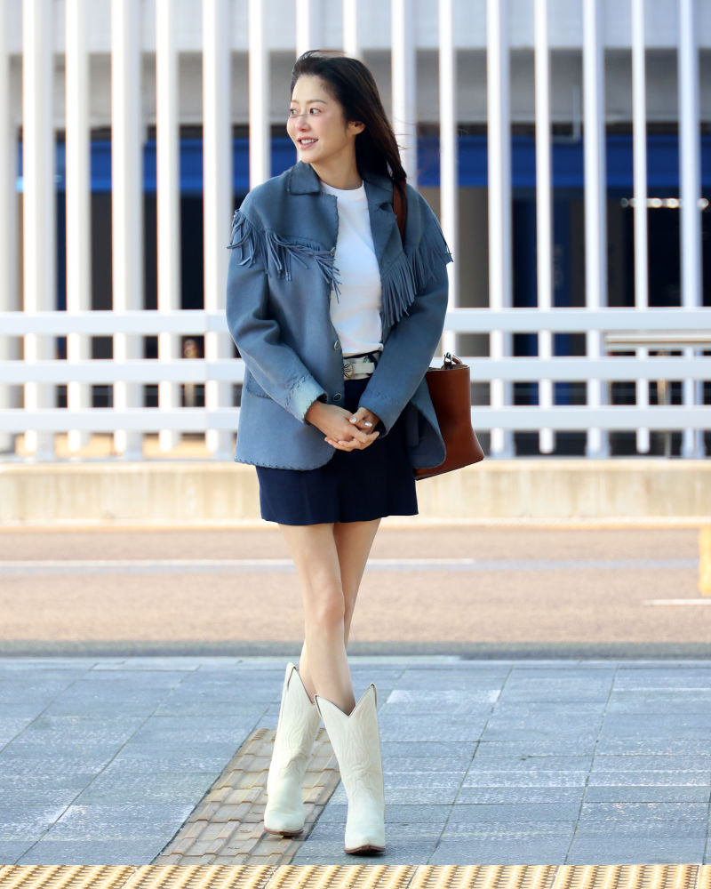고현정은 청량한 블루톤의 프린지 장식 재킷에 네이비 컬러 리넨 쇼츠를 매치해 캐주얼하면서도 세련된 봄 패션을 완성했다. 여기에 고급스러운 카멜 브라운 컬러 버킷백이 포인트가 되어 전체적인 스타일의 밸런스를 안정감 있게 잡아준다. 마지막으로 산뜻한 화이트 컬러의 웨스턴 미들 부츠를 함께 스타일링해 아메리칸 웨스턴 감성을 현대적으로 재해석한 감각적인 패션을 완성했다.