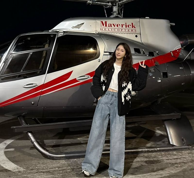 두 번째 스타일은 루즈한 핏의 와이드 데님 팬츠에 니트 아우터를 매치한 룩으로, 그녀의 자유로운 감성과 빈티지한 분위기가 돋보인다.