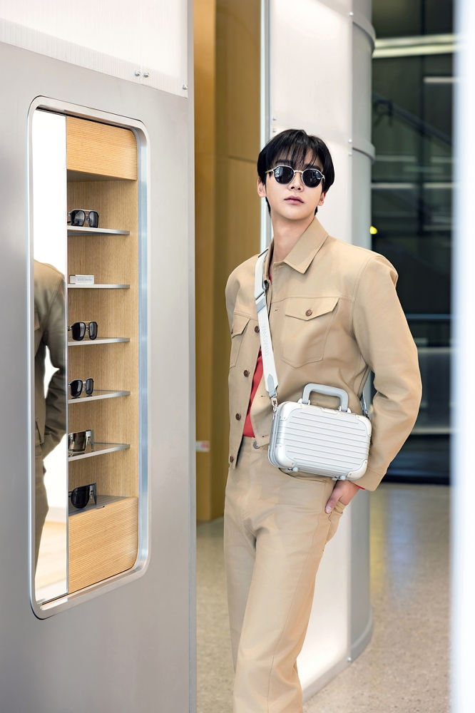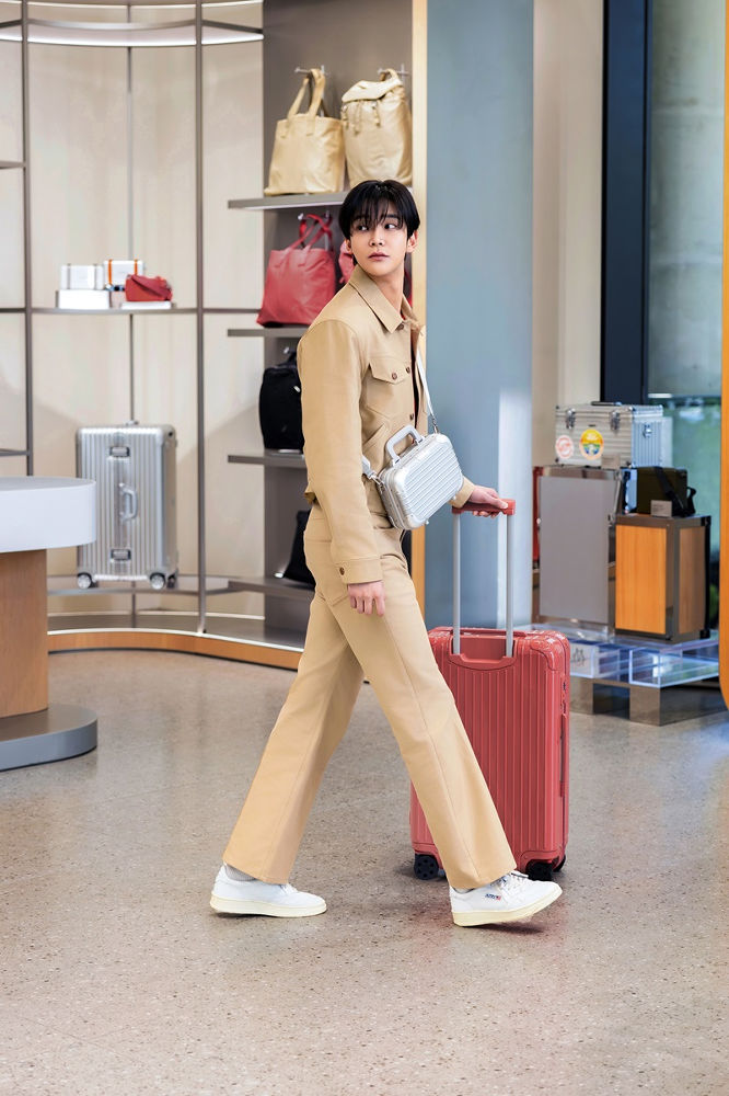 뉴 컬러의 모티브가 된 멕시코의 자연물을 연상시키는 윈도우 디스플레이와 함께, 리모와 청담 플래그십에 들어서면 브랜드의 컬렉션 전반을 한눈에 볼 수 있도록 탁 트인 공간감을 느낄 수 있다. 매장 전면의 벽을 장식한 다양한 크기의 오리지널 수트케이스 디스플레이는 알루미늄 소재에 담긴 브랜드의 아이덴티티를 가장 잘 보여준다. 이처럼 브랜드의 상징적인 공간에서 로운은 오리지널 컬렉션의 디자인 DNA를 계승하여 모던한 데일리 백으로 재탄생한 오리지널 백 실버를 함께 착용하여, 브랜드 프렌즈로서 아이코닉한 모습을 연출하였다.