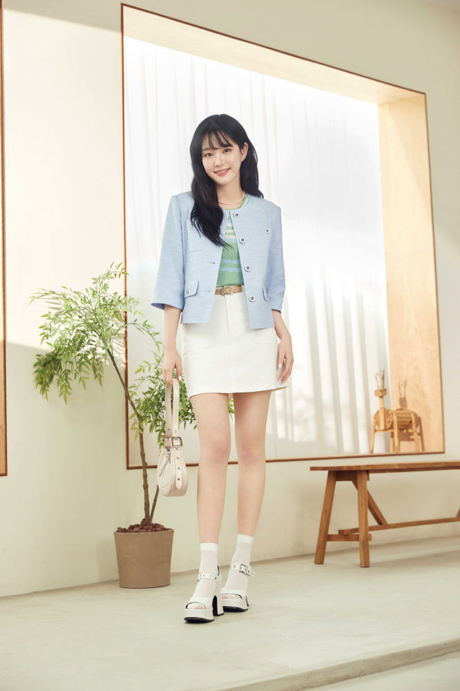 첫 번째 화보에서는 스카이 블루 컬러의 7부 소매 자켓에 컬러 배색 반팔 니트와 화이트 미니 스커트를 매치해 청량하면서도 세련된 썸머룩을 완성했다. 미니멀한 실루엣에 컬러 포인트를 더한 스타일링이 눈길을 끈다.