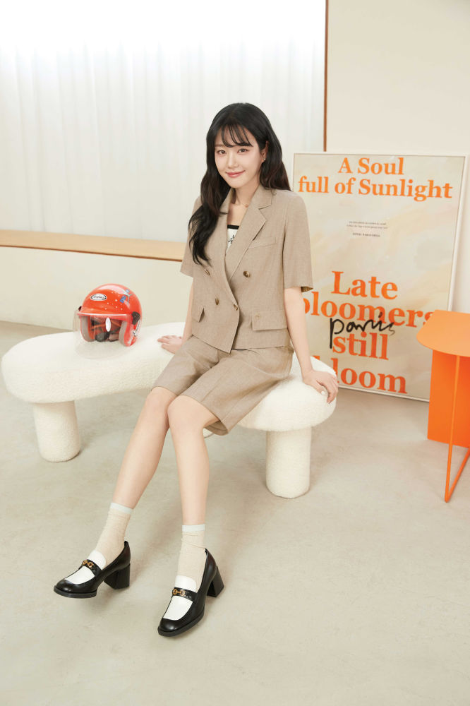 두 번째 화보에서는 베이지 컬러의 크롭 반팔 자켓과 숏팬츠를 셋업으로 매치하여 데일리룩은 물론 오피스룩으로도 손색없는 단정하고 깔끔한 무드의 모던 셋업룩을 완성했다.