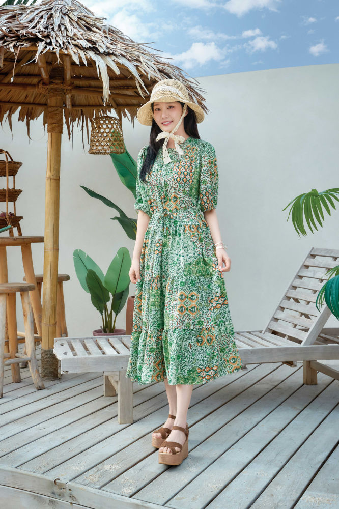 마지막으로는 벨티드 스타일의 블루 롱 원피스를 착용해 우아한 실루엣과 함께 시원하고 여유로운 썸머 무드를 연출했으며, 이어서 에스닉 패턴의 폴리 롱원피스와 밀짚모자를 매치하여 감각적인 보헤미안 스타일의 바캉스룩을 선보였다.