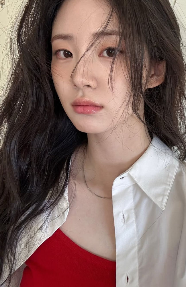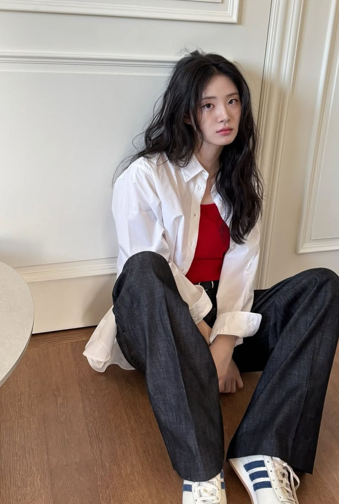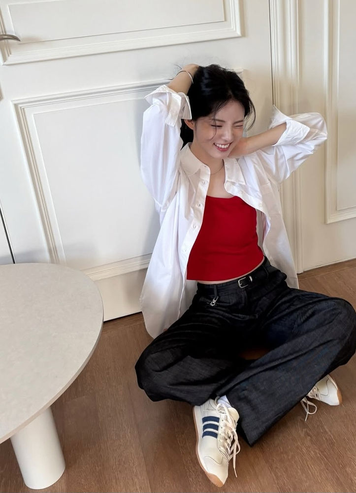 우선, 첫 번째 룩은 화이트 셔츠를 루즈하게 걸치고, 이너로 강렬한 레드 컬러의 슬리브리스 톱을 매치해 생기를 불어넣은 데일리 스타일다.