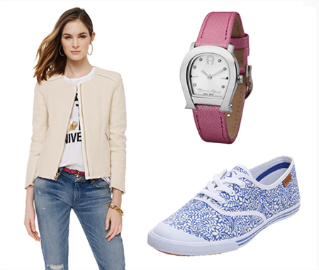 여기에 밝은 블루컬러에 화이트 나뭇잎 패턴이 새겨진 에이글의 스니커즈를 매치한다면 편안하면서 스타일리시한 봄 패션을 완성할 수 있다. 보다 경쾌하고 발랄한 포인트를 주고 싶다면 상큼한 핑크 스트랩의 아이그너 워치를 추천한다.