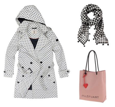 캐주얼하며 발랄한 느낌의 쥬시꾸뛰르의 깅엄체크 머플러를 함께 매치하면 환절기 스프링 룩에 트렌디한 포인트를 줄 수 있다. 또한 질스튜어트 액세서리의 핑크컬러 쇼퍼백은 사랑스러운 느낌을 좀 더 배가시켜준다.