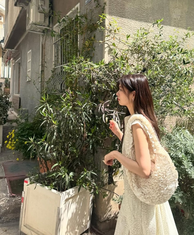 반면, 두 번째 화이트 룩은 한층 밝고 부드러운 분위기가 느껴지는 룩이다.