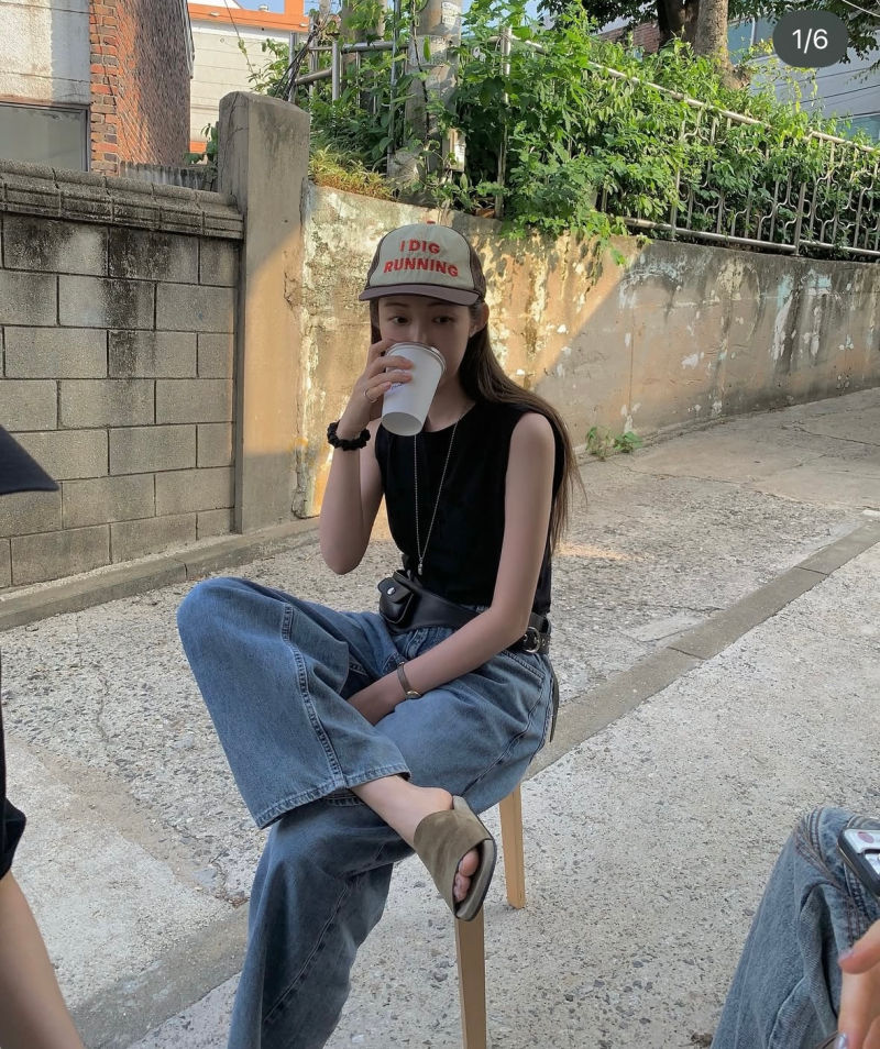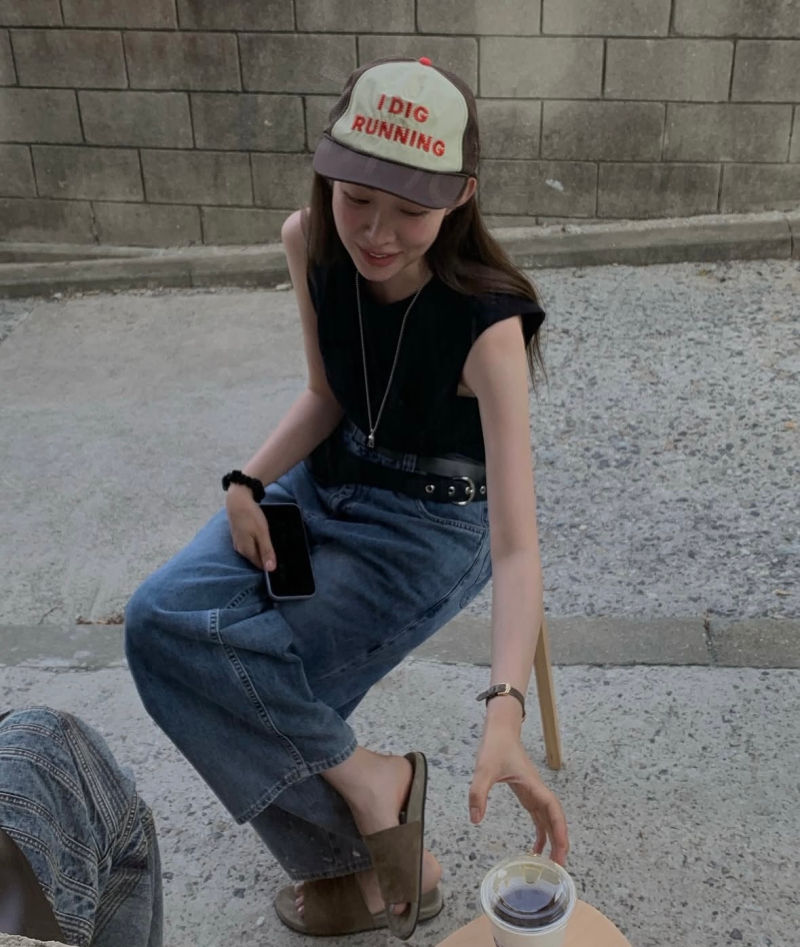 블랙 컬러의 민소매 탑과 여유로운 실루엣의 데님 팬츠를 매치해 자연스럽고 편안한 분위기를 연출했다. 허리에는 벨트대신 미니백을 스타일링해 포인트를 줬다.