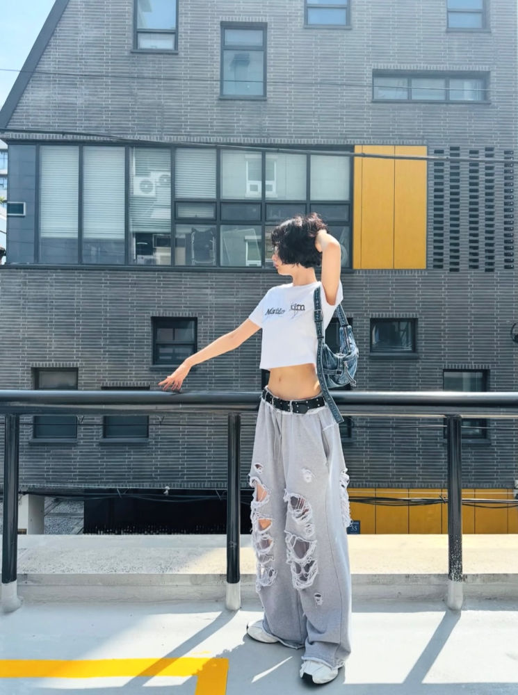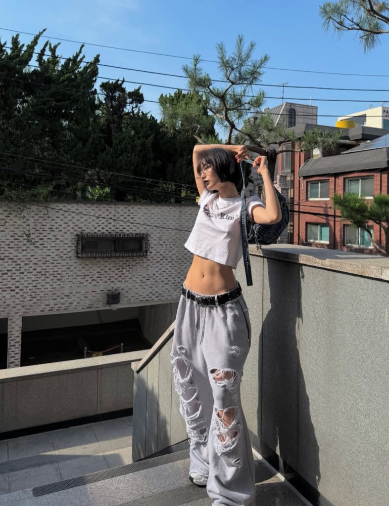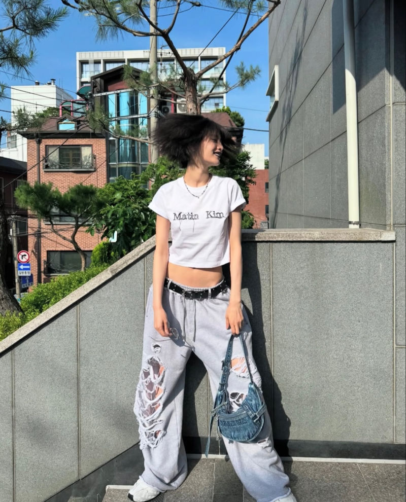 시크한 무드의 크롭 티셔츠로 시원하고 당당한 여름 감성을 강조, 하의는 전면이 과감하게 찢어진 디스트로이드 데님 팬츠를 초이스해 그녀만의 개성이 돋보이는 룩을 완성했다. 함께 매치한 데님백과 스니커즈는 Y2K 감성을 세련되게 풀어낸 느낌이다.