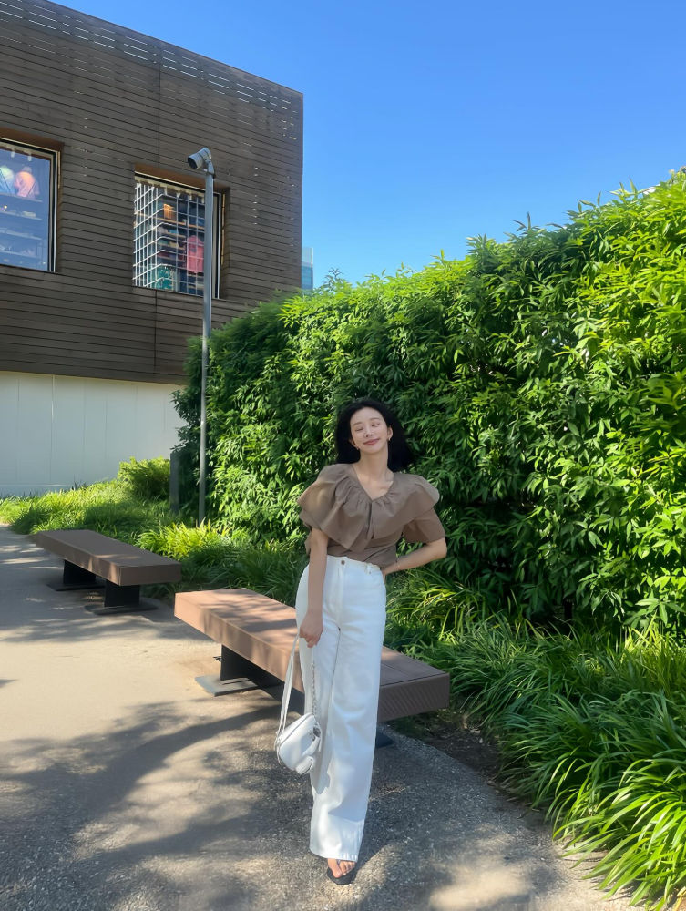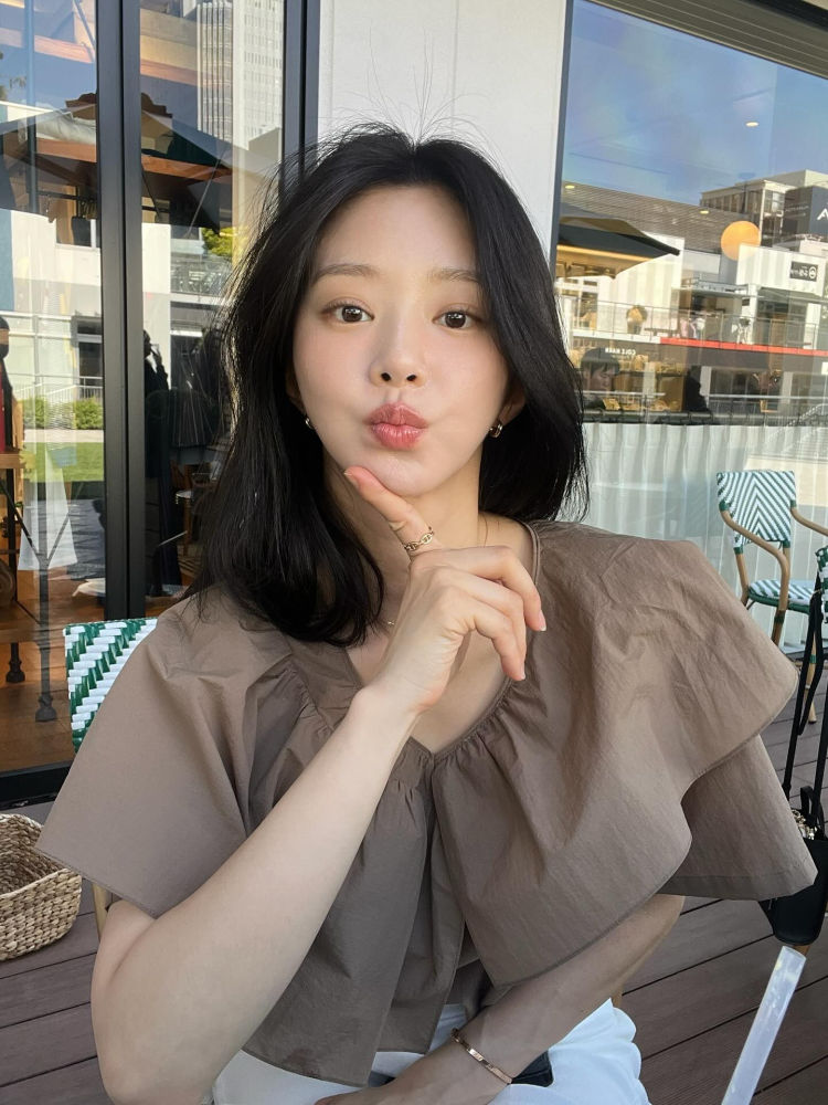 게시물 속 이주빈은 브라운 컬러의 러플 블라우스와 화이트 데님 팬츠를 매치하여 세련하면서도 캐주얼한 여름 휴가룩을 선보였다.