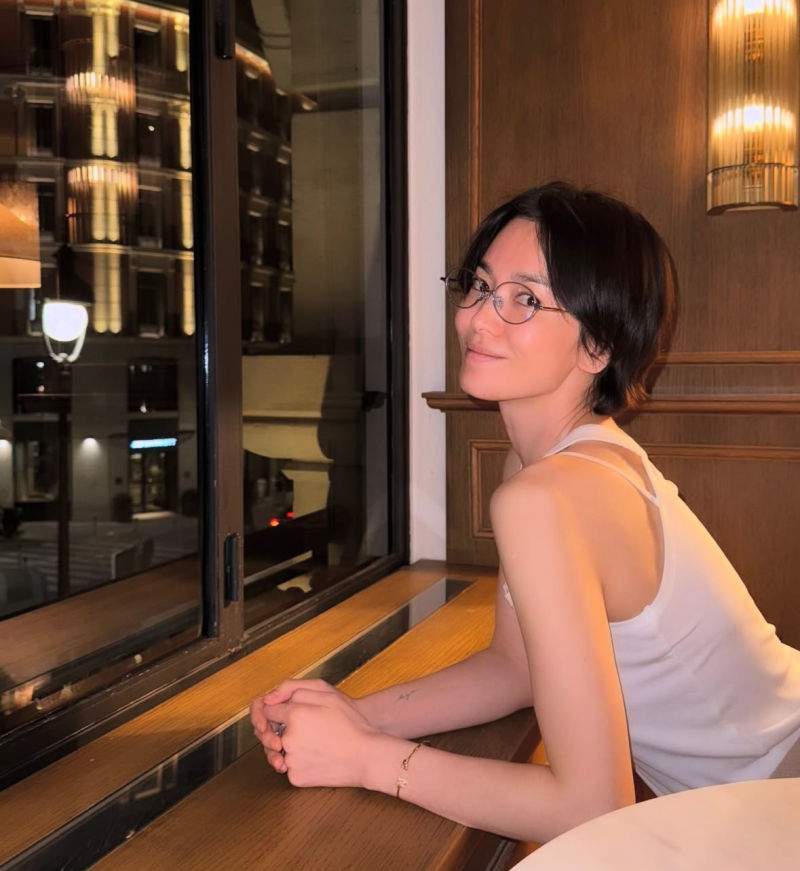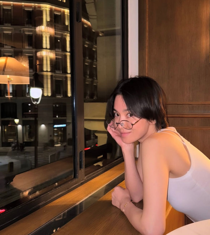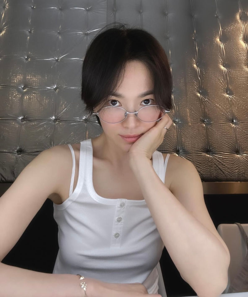 배우 송혜교는 이 클래식한 여름 공식에 현대적인 무드를 더해 심플하고 세련된 데일리룩을 선보였다.
