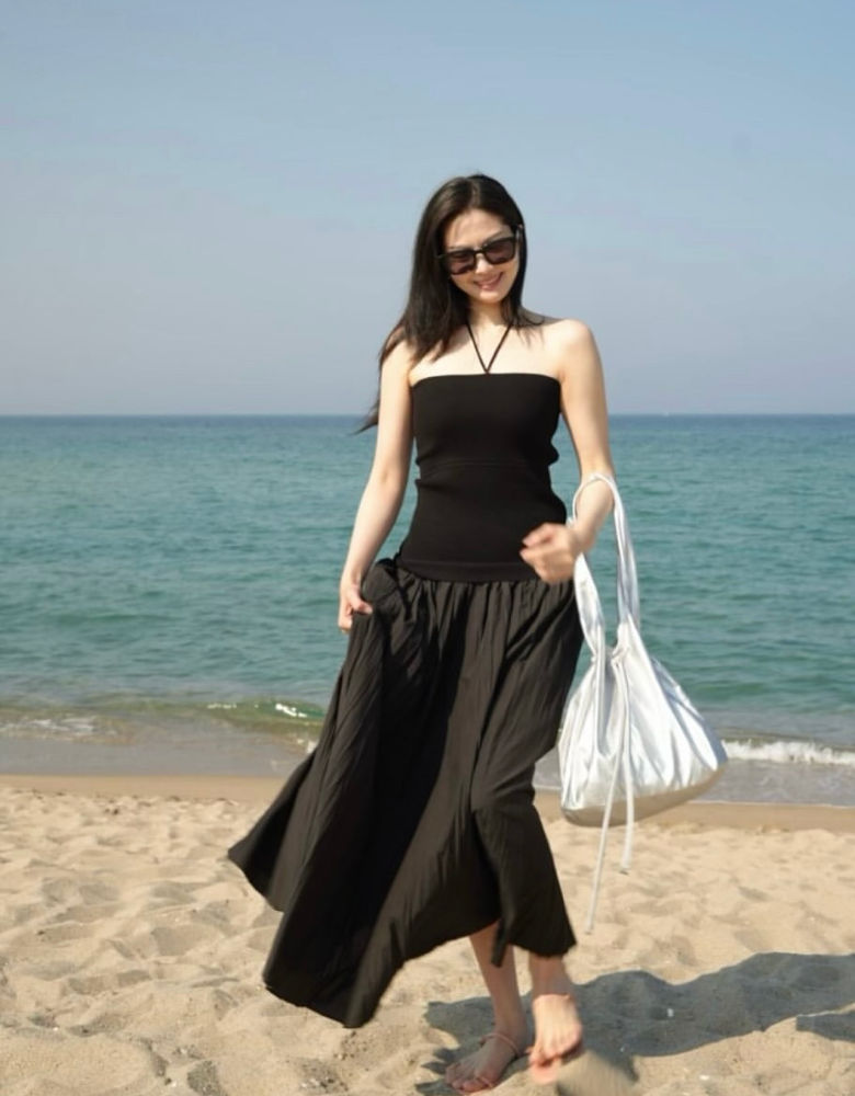 이번 룩에서 가장 눈에 띄는 포인트는 튜브탑과 맥시스커트의 조합이다. 상의는 얇은 스트랩이 목 뒤로 이어지는 슬림한 튜브탑을 초이스해 쇄골과 어깨 라인이 드러나는 시원한 느낌을 연출했다.