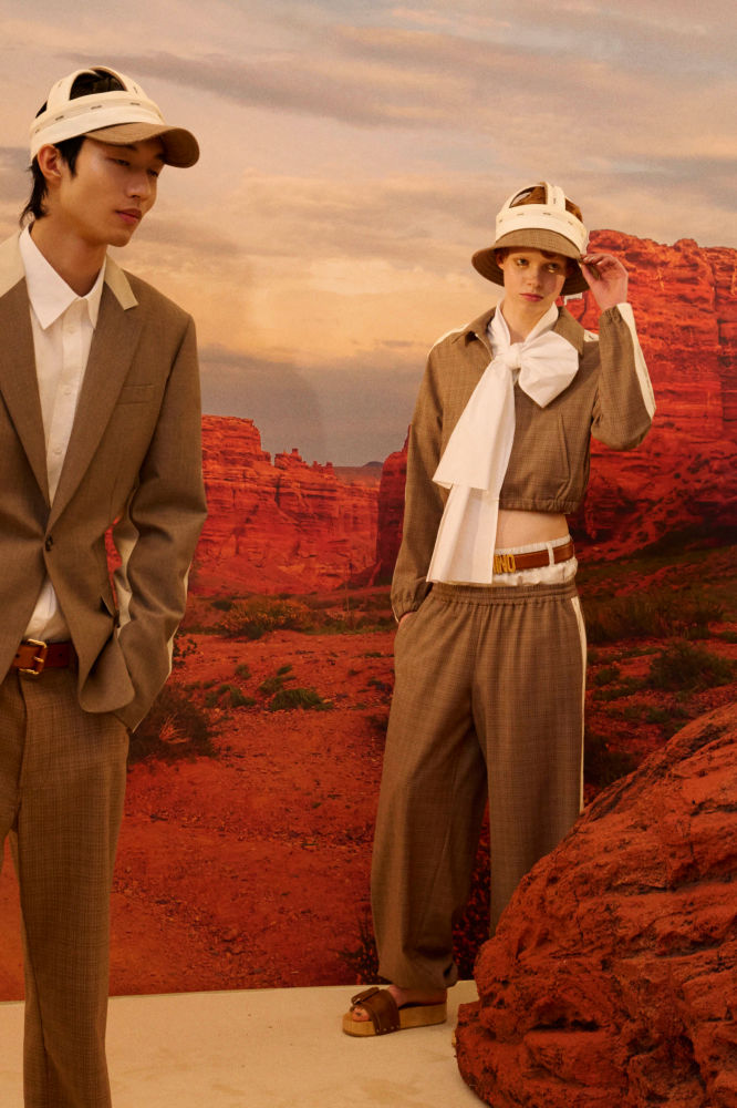 이후 컬렉션은 그랜드 캐니언의 장대한 풍경을 배경으로, 차분한 무드로 전환된다. 흙빛과 붉은빛, 바랜 하늘색 등 자연에서 영감을 받은 컬러 팔레트를 바탕으로, 데님, 구조적인 화이트 블라우스, 스포츠 웨어 요소가 가미된 테일러링, 그리고 거위 모티프의 드레스를 통해 실용적이면서도 감각적인 스타일을 제안한다.