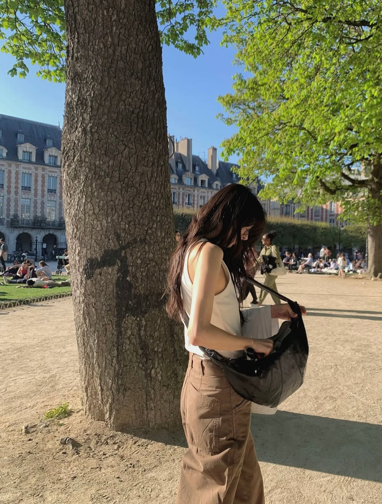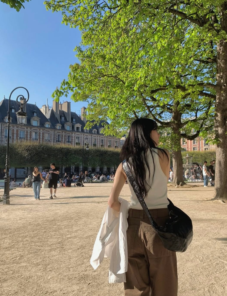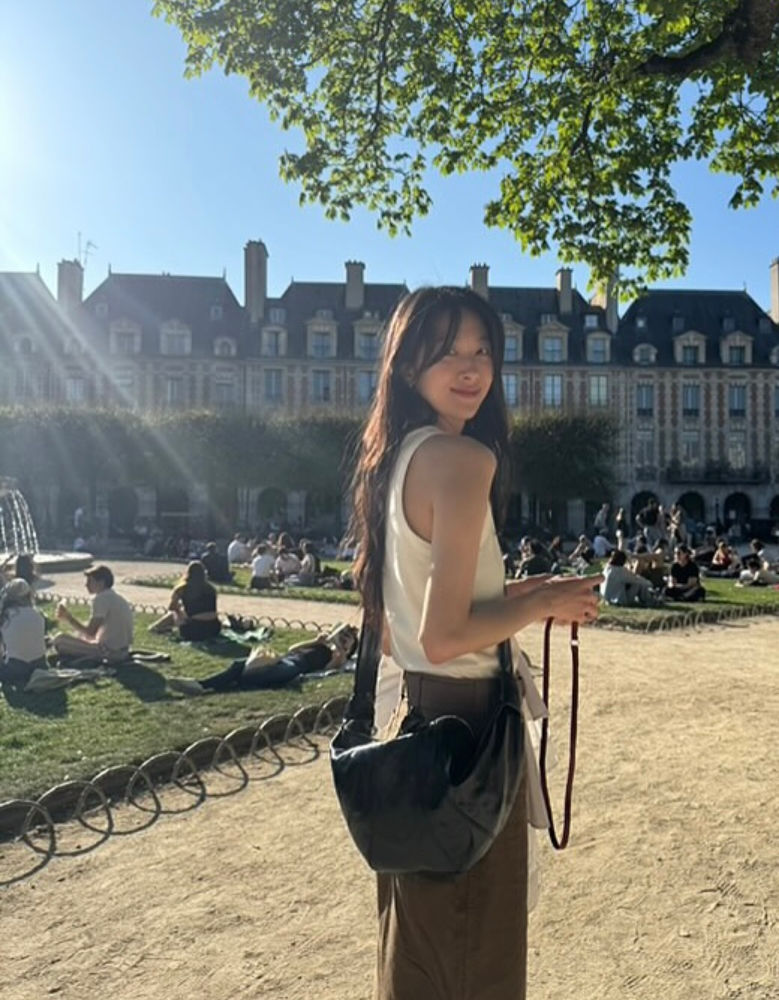 파리의 햇살 아래 포착된 민하는 아이보리 톤의 슬리브리스에 롱 스커트를 매치해 우아하면서도 내추럴한 여름 룩을 완성했다. 심플한 디자인의 탑과 롱 스커트, 여기에 민하는 브라운 컬러의 크루아상 백으로 포인트를 더했다.