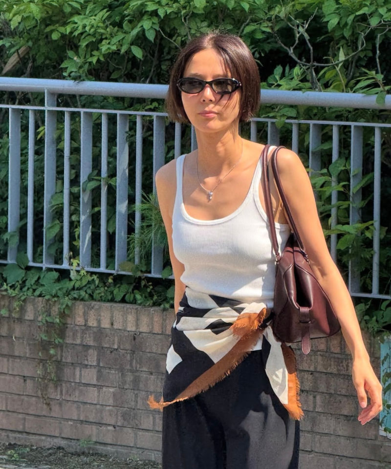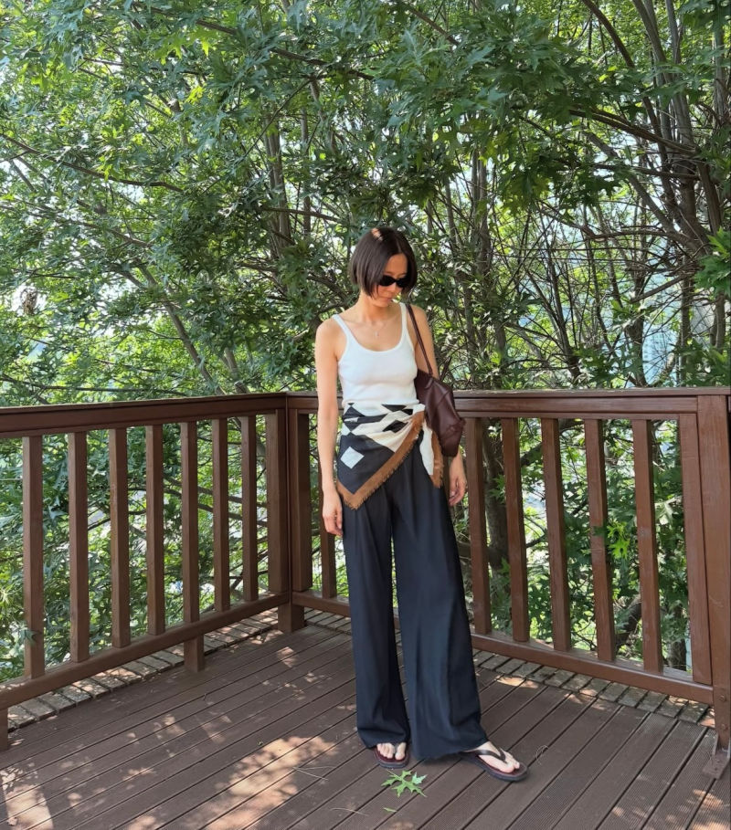 반면, 김나영은 같은 슬리브리스 탑을 전혀 다른 무드로 연출했다. 화이트 슬리브리스에 와이드 팬츠를 매치하고, 허리에 스카프를 둘러 포인트를 준 것.