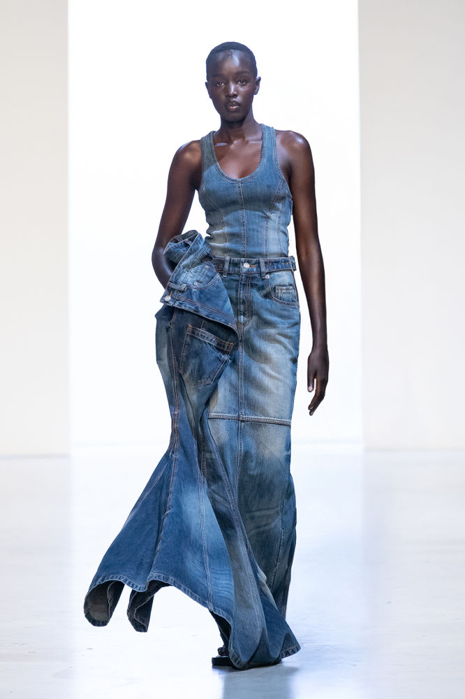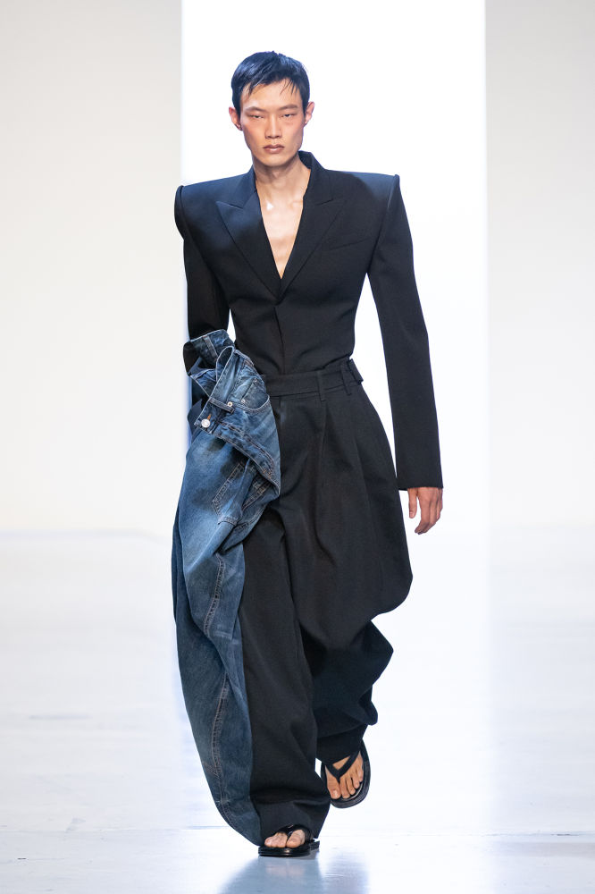 특히 준지의 미학인 ‘극적이고 아름다운 대비’를 중점적으로 표현했다. 클래식한 슈팅 원단(Suiting, 정장용 원단)과 데님의 결합, 상·하의 간 극적인 볼륨감과 길이감의 대비, 그리고 성의 경계를 넘나드는 것을 보여줬다.
