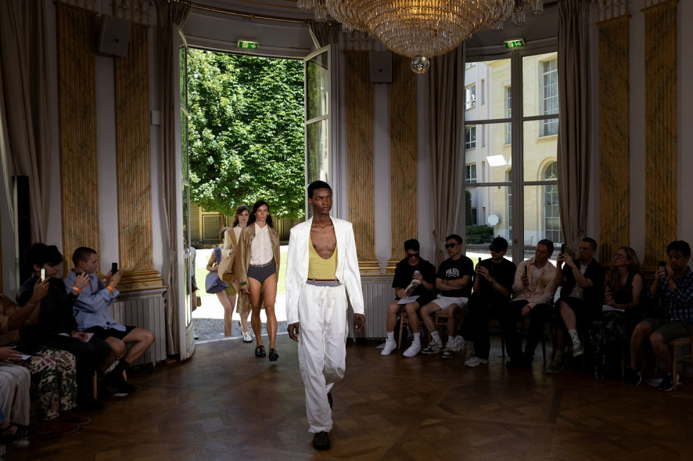뜨거운 날씨와 도시적인 포멀웨어라는 상반된 요소를 조화롭게 수용하며, 클래식한 옷장의 구성 요소들을 ‘가벼움’이라는 관점에서 재구성했다. 실크 비스코스 소재의 테일코트, 얇은 모헤어 니트웨어, 탈부착이 가능한 셔츠 칼라 위에는 햇살을 반사하는 섬세한 장식이 놓여 있어, 여름의 빛과 공기를 시각적으로 표현한다.