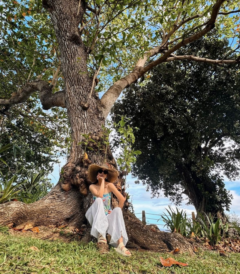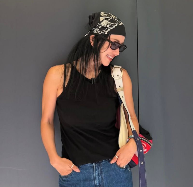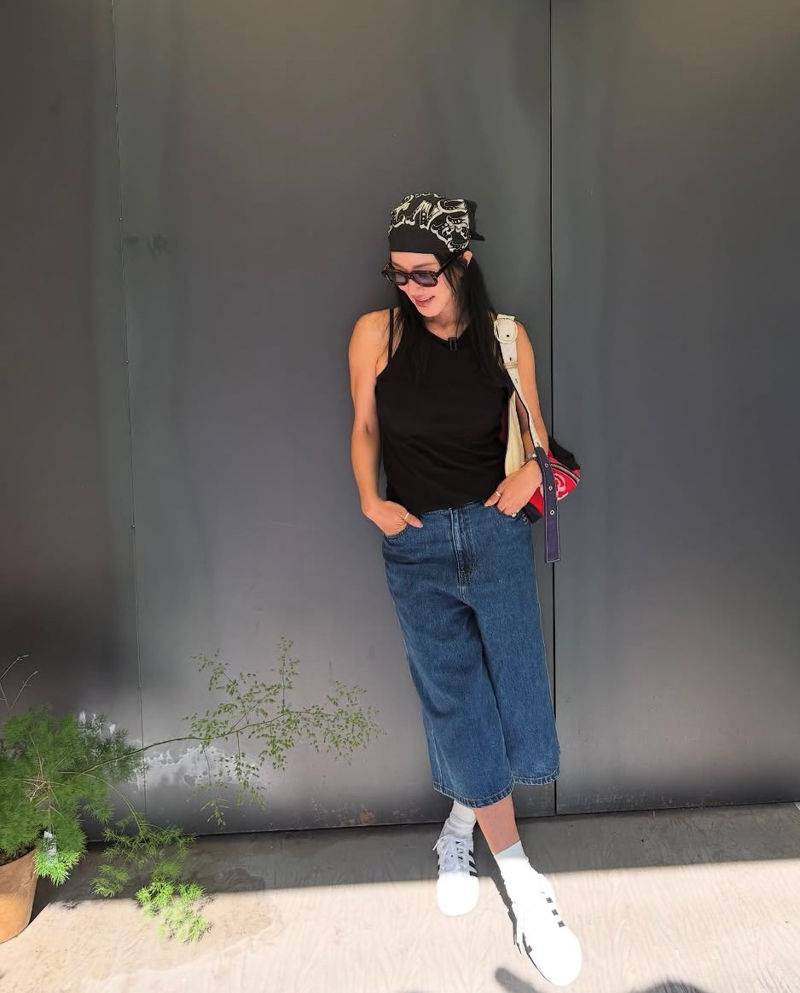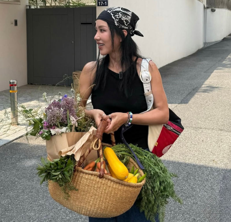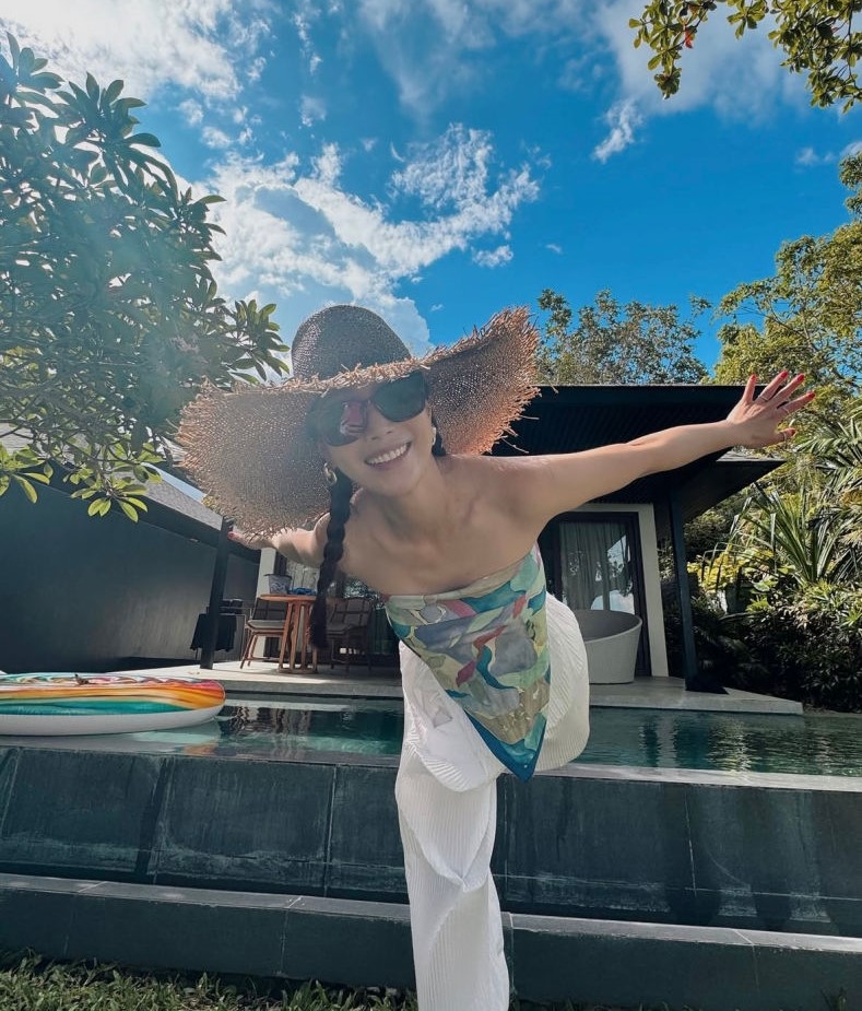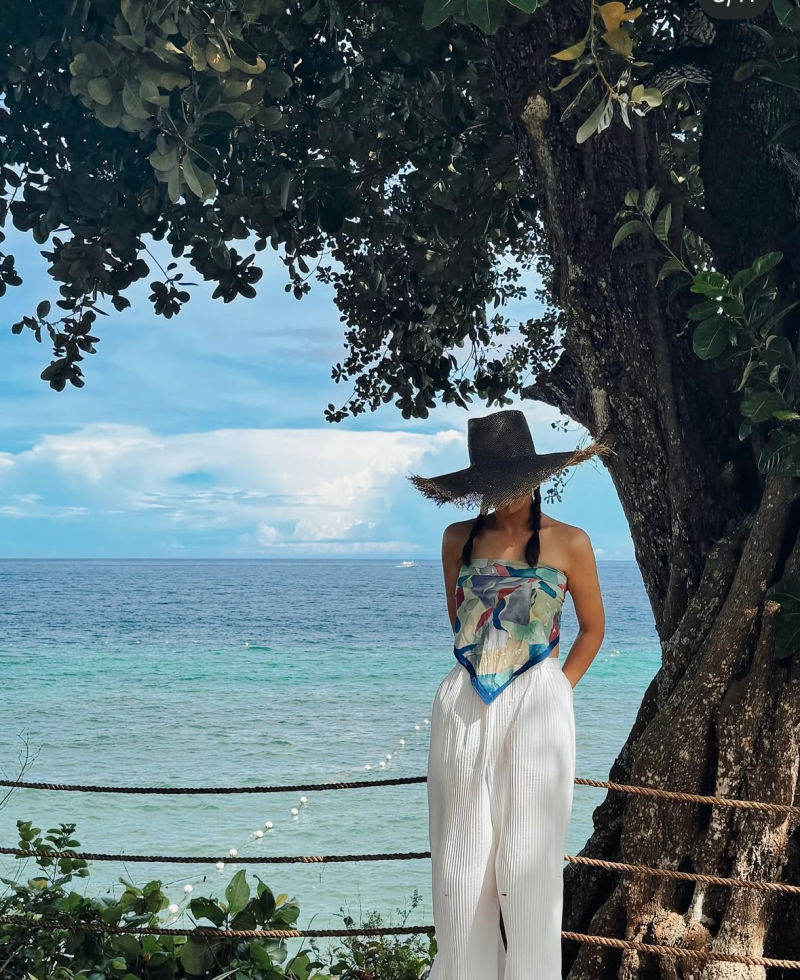 화려한 패턴의 스카프를 탑으로 매치해 튜브톱처럼 연출하고, 하이웨이스트 화이트 팬츠와 라피아 햇을 더해 이국적인 분위기를 강조했다. 그녀의 스타일은 여름휴가 시즌 완벽한 예시가 될 만큼 우아하면서도 경쾌하다.