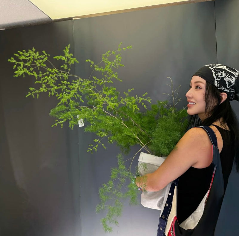 엄정화는 블랙 슬리브리스 톱과 데님 팬츠라는 심플한 조합에 스카프를 머리에 두른 ‘반다나 스타일’을 선보였다. 여기에 선글라스와 포인트 백, 심플한 액세서리들을 더해 쿨하고 자유분방한 무드로 완성했다.