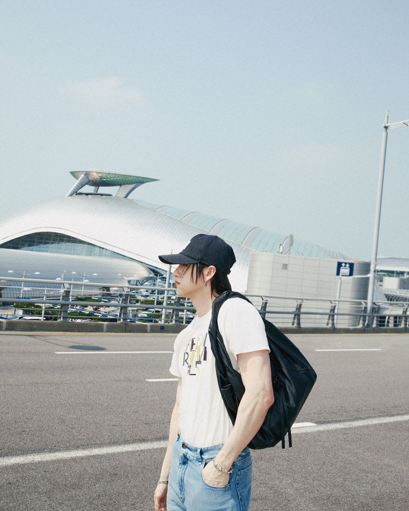 심플한 화이트 그래픽 티셔츠에 여유로운 핏의 데님 진, FF 로고 베이스볼 캡을 매치해 럭셔리함과 편안함이 조화를 이루는 공항패션을 연출했다. 여기에 펜디 FW25 컬렉션의 펜디 핏(Fendi Fit) 트레이너와 실버 주얼리로 은은한 포인트를 더했다.