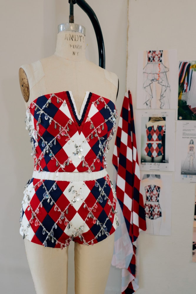 지난 26일 공연에서는 레드, 화이트, 블루의 프레피 아가일 패턴이 돋보이는 바디슈트를 착용했으며, 새틴 소재 위에 크리스탈 비즈가 수작업으로 장식되어 은은한 광택을 자아냈다. 한땀 한땀 장식된 디테일은 걸음마다 반짝이며, 솔로 무대를 선보인 지수는 스타디움 조명 조명 아래 한층 더 눈부신 존재감을 발휘했다.