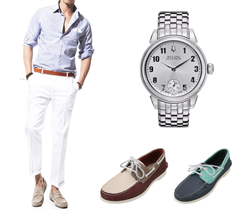 여기에 신발은 착용감이 좋으면서도 발등이 드러나 시원한 느낌을 주는 데크 슈즈를 착용하면 다리가 길어 보이는 효과까지 얻을 수 있다. 좀더 발랄하고 산뜻한 분위기를 더하고 싶다면 컬러 블로킹 슈즈를 추천한다. 특히 메탈 디자인의 시계를 착용하며 소재가 주는 청량함과 세련된 느낌을 배가 시킬 수 있다.