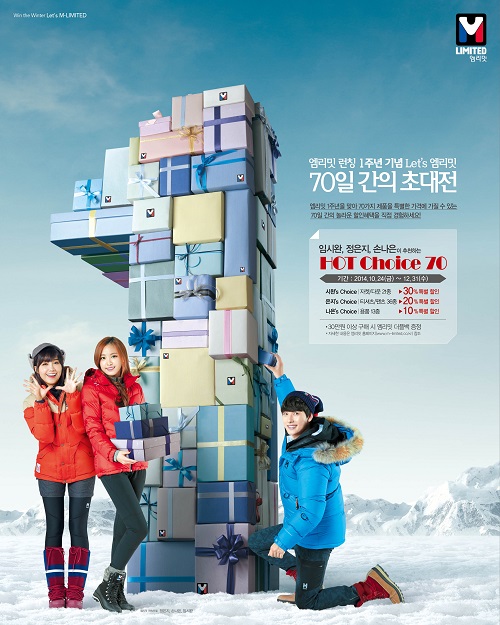 10월 24일부터 12월 31일까지 70일간 열리는 이번 행사는 엠리밋의 전속모델인 임시완, 정은지, 손나은이 70가지 아이템을 추천하는 3인3색 윈터 페스티벌이다. 할인 대상 품목은 2014 F/W 시즌 엠리밋 신상품으로 구성됐다.