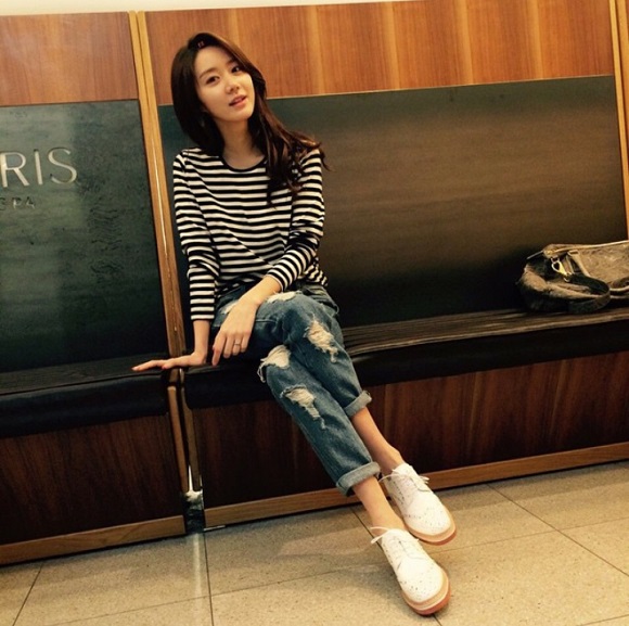 일상생활에서 감각적인 패션센스를 선보이고 있는 한그루는 스트라이프 패턴의 티셔츠와 디스트로이드 진을 매치한 자연스러운 데일리룩을 연출했다. 여기에 크리스털과 스터드 장식이 돋보이는 화려한 옥스퍼드화를 포인트로 스포티한면서 세련된 멋을 완성시켰다.