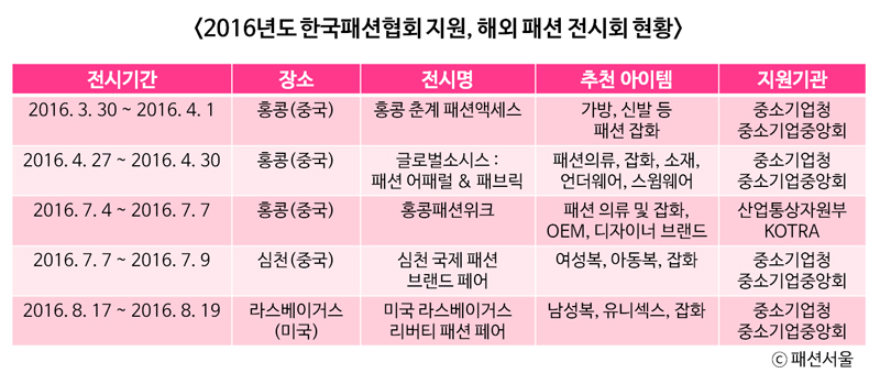 올해 지원되는 해외 패션 전시는 홍콩 패션 액세스, 글로벌소시스-패션 어패럴&패브릭, 홍콩패션위크, 심천 국제 패션 브랜드 페어, 미국 라스베가스 리버티 패션 페어 등 5개 전시로 협회는 각 전시의 특성을 고려한 패션기업의 참가를 추천하며 특히 홍콩 패션 액세스와 글로벌 소시스 – 패션 어패럴&패브릭 전시는 오는 1월 13일까지 업체모집을 진행하고 있다.