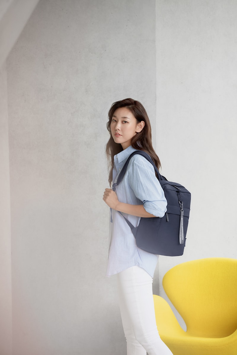 은은한 하늘색 셔츠와 화이트 팬츠의 스타일리시한 룩에 스트랩 장식이 유니크한 캐주얼 백팩을 포인트로 네추럴 한 데일리 룩을 완성했다. 한혜진이 착용한 백팩은 만다리나덕의 ‘SELVEDGE(셀비지)’로 지난 만다리나덕 SS화보에도 선보여 ‘한혜진 백팩’으로 온라인 상에서 화제가 된 제품이다.