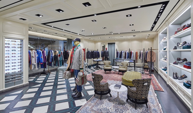 또한, 예상치 못한 다양한 소재들의 조합 역시 멘즈 스토어를 특별하게 만드는 요인 중 하나다. 바닥은 다양한 컬러의 목재를 사용해 3차원 효과를 연출했으며, 화이트 대리석 파사드와 아이보리 컬러의 스토어 내부 벽, 세이지 그린 선반과 오리엔탈 풍의 빈티지 러그가 어우러져 더욱 풍성한 분위기를 연출한다. 이로써 매혹적이며 놀라운 구찌 특유의 느낌을 주는 특별한 공간을 완성했다.
